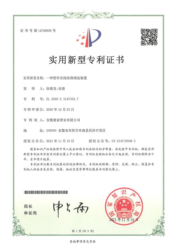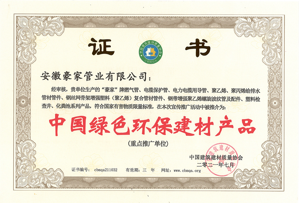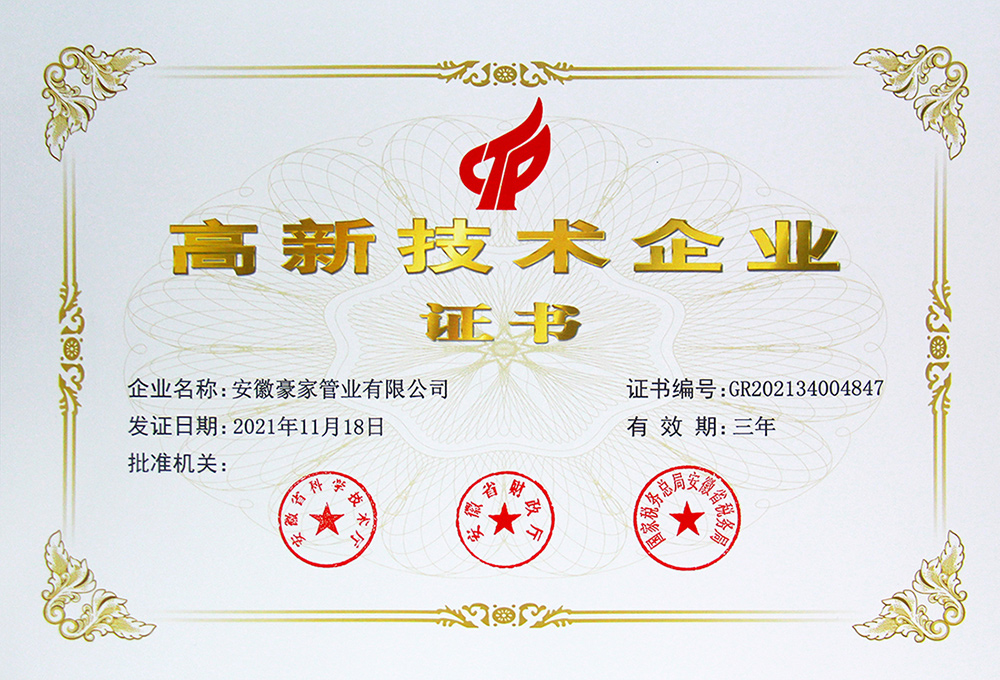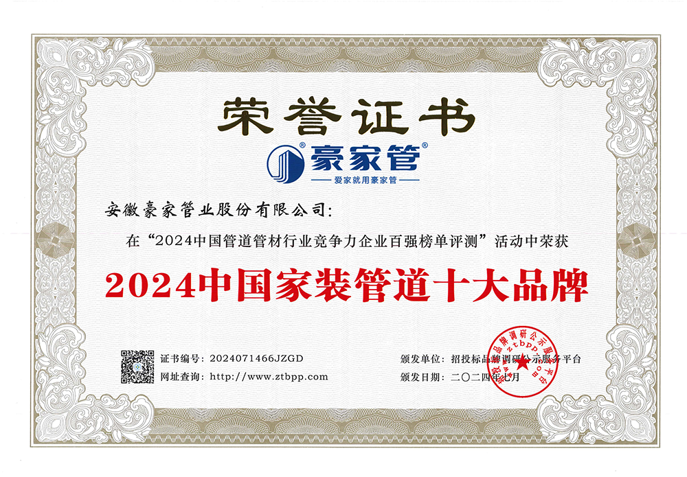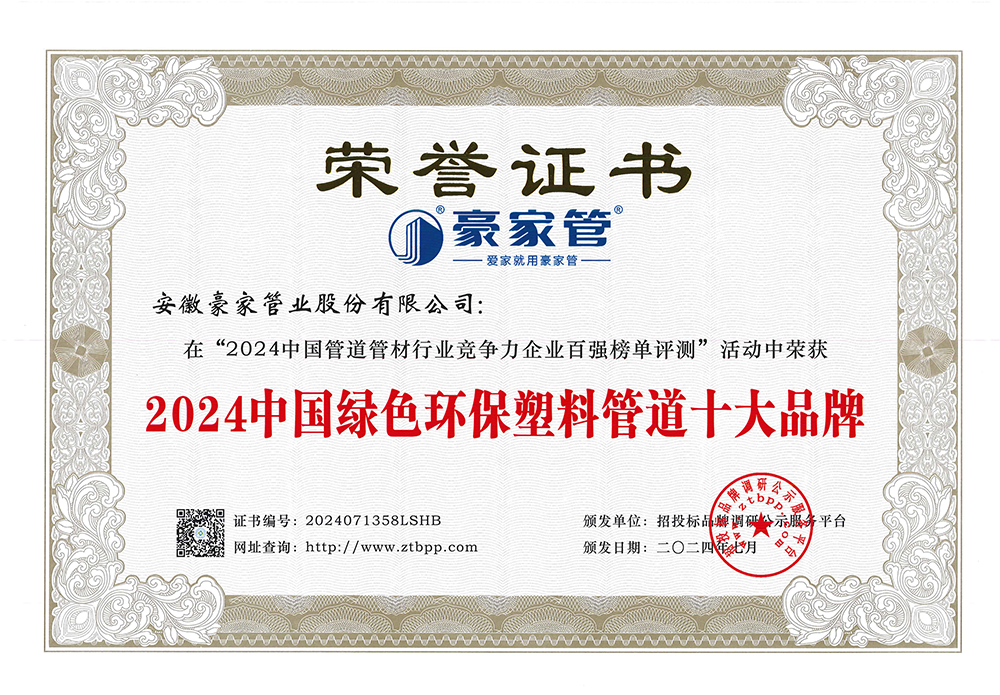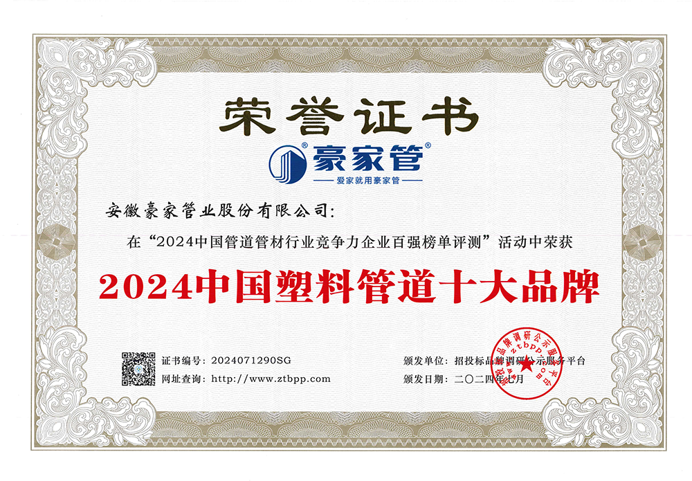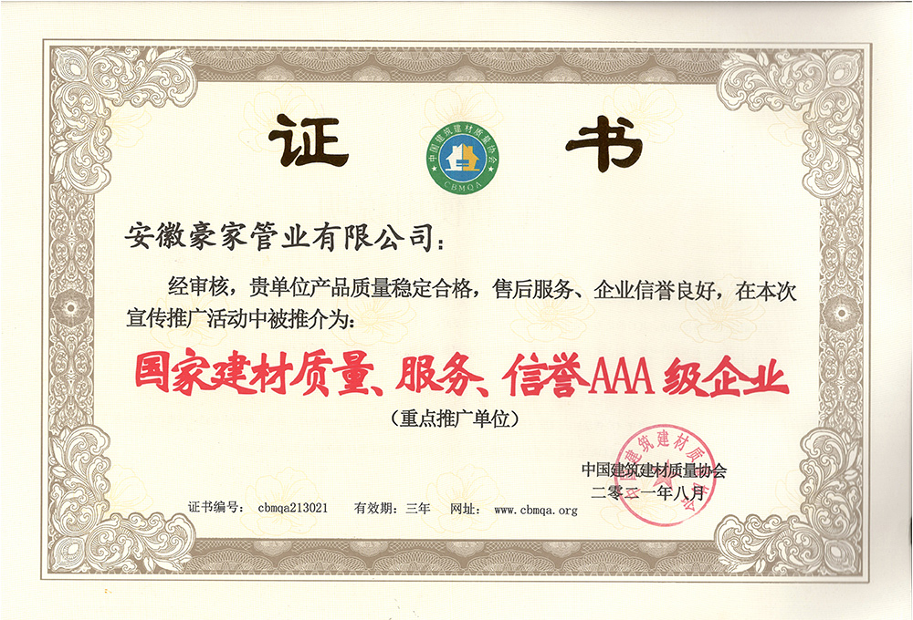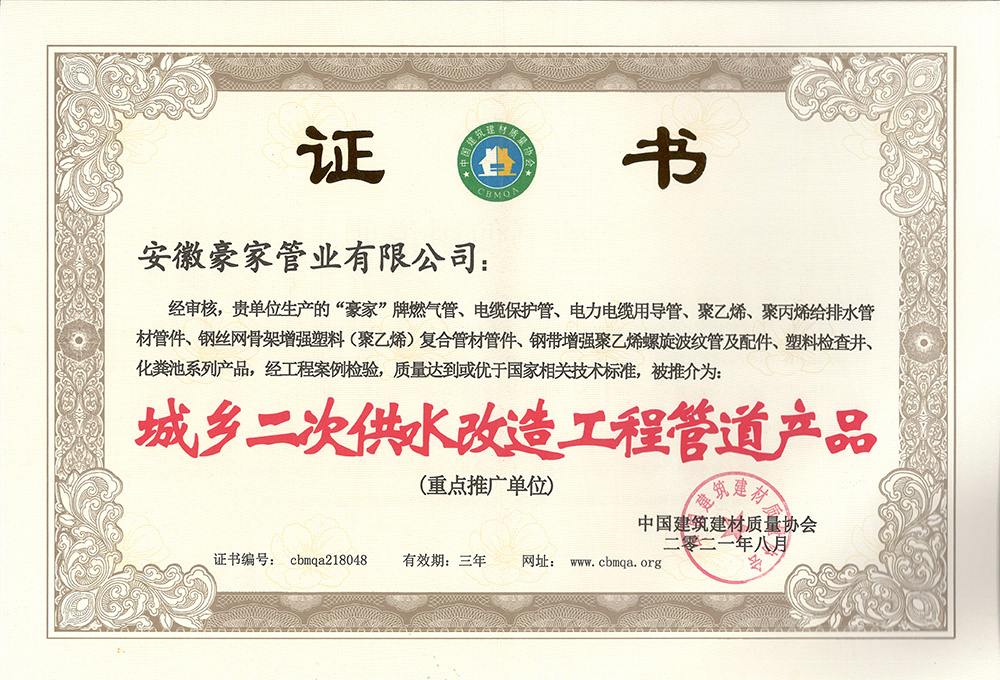 多年來(lái),豪家管業(yè)注重科技研發(fā),秉承“質(zhì)量求生存、信譽(yù)求發(fā)展”發(fā)展理念,產(chǎn)品通過(guò)國(guó)家的檢測(cè)機(jī)構(gòu)檢測(cè),技術(shù)指標(biāo)均高于相關(guān)標(biāo)準(zhǔn),多次參與編寫(xiě)相關(guān)國(guó)家標(biāo)準(zhǔn)、產(chǎn)品圖集、擁有多項(xiàng)發(fā)明和國(guó)家專利,受到行業(yè)和 市場(chǎng)的廣泛認(rèn)可,也斬獲眾多榮譽(yù)。